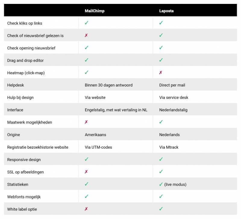 Laposta offers quite a few additional options, certainly interesting for the Dutch market. MailChimp may not offer a white-label option, but if you buy in credits (pay as you go) or take out a subscription, you can send out mailings without seeing that they were created with MailChimp. The cost of this is not very high.