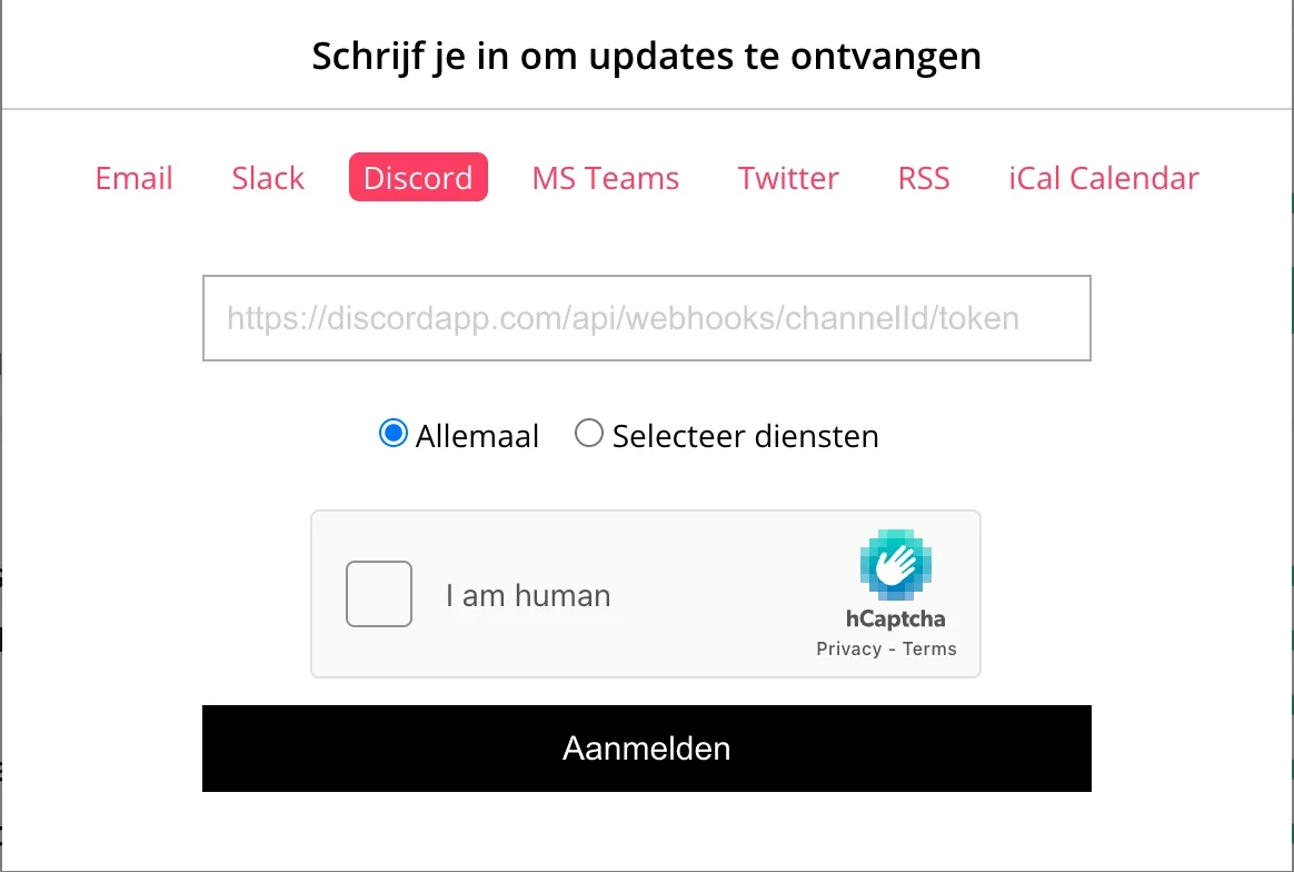 From now on, you can also receive our maintenance and outage notifications via Discord or Microsoft Teams. Go to https://status.hosting.nl, click on Sign up for free updates and then click on Discord or MS Teams.