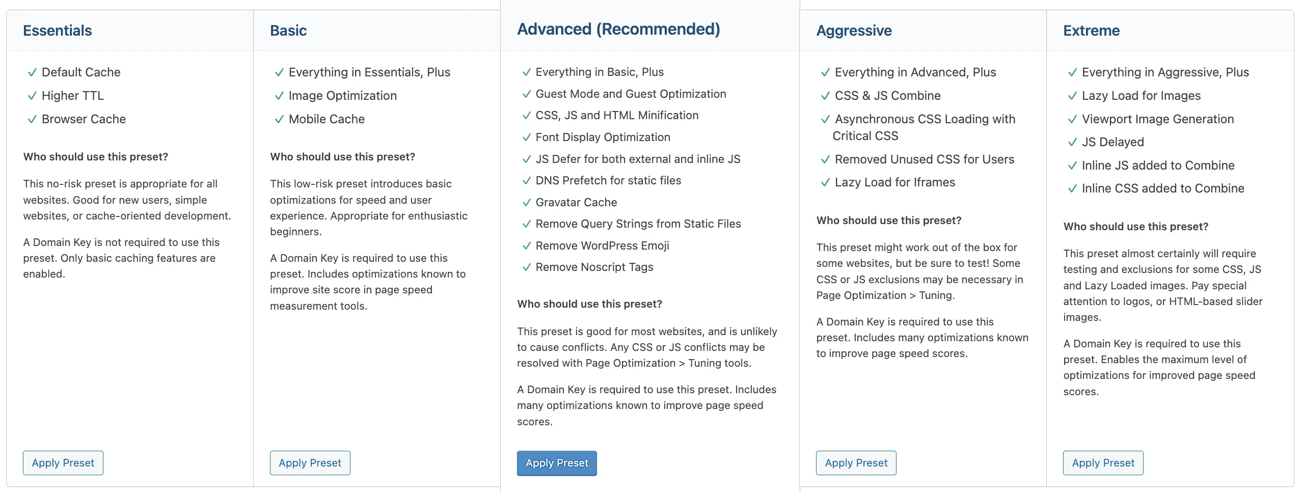 There are five preset profiles available to choose from to speed up your website. Go for no risk with the Essentials profile, go for extreme optimization with the Extreme profile or choose something in between. After setting it up, test the website properly and if necessary, choose another optimization profile.