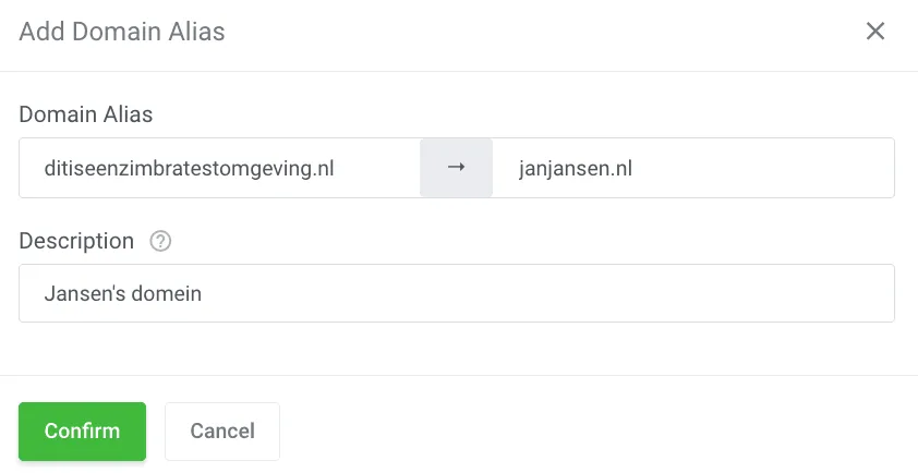 - Enter the new domain alias and then click Confirm to add the domain alias