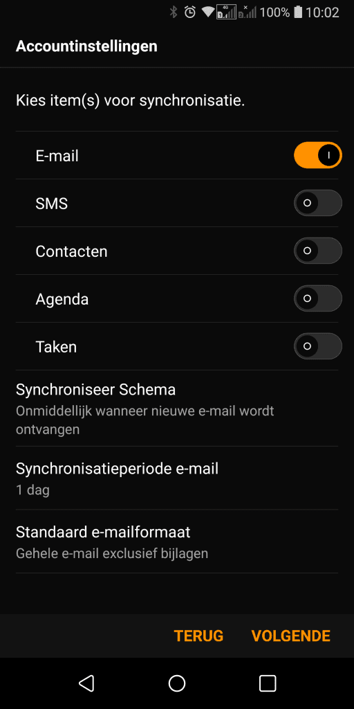 - On this screen you can specify what you want to synchronize with the Exchange server and also when and how often this should happen.
