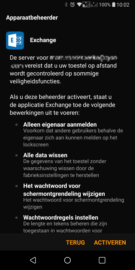 - Finally, permission must be given that this device can be used to connect to the Exchange server. Unfortunately, it is not possible to skip this screen, in order to use the account, “Activate” must be clicked.