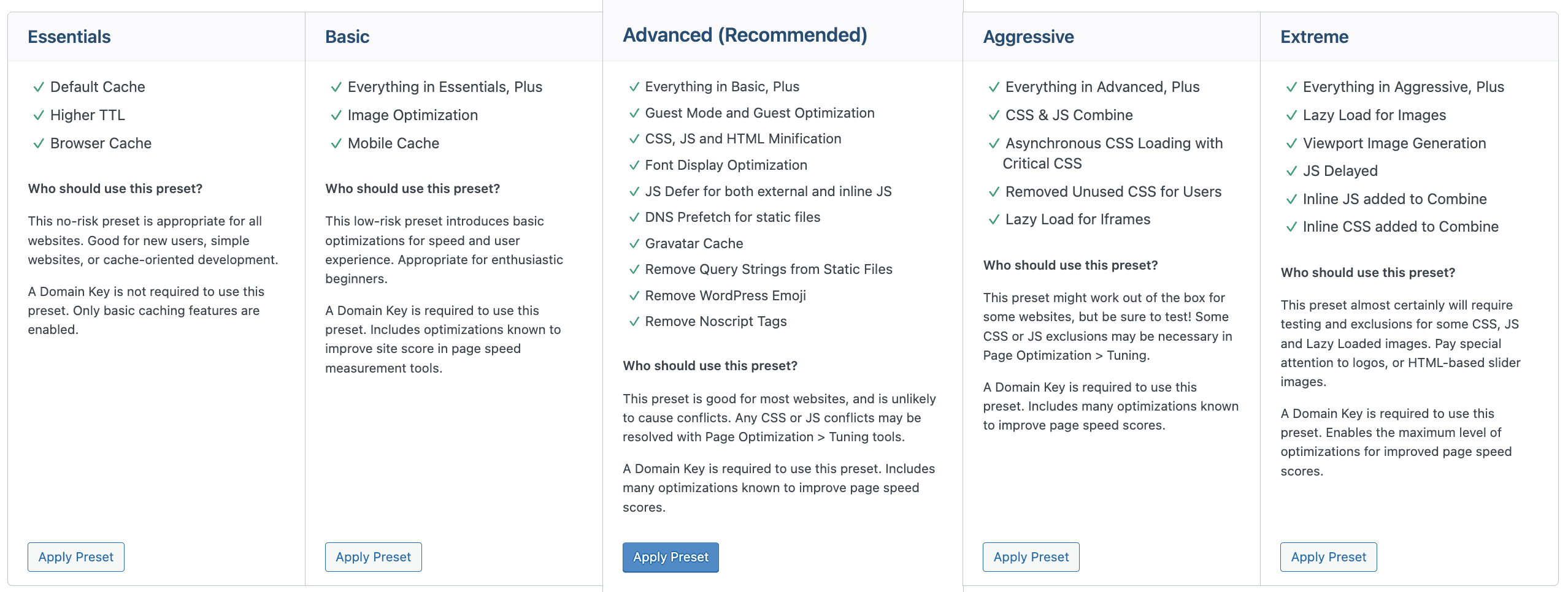 Er zijn vijf vooringestelde profielen beschikbaar waaruit je kunt kiezen om je website te versnellen. Ga voor geen enkel risico met het Essentials profiel, ga voor extreme optimalisatie met het Extreme profiel of kies voor iets er tussen in. Test de website na het instellen goed en kies indien nodig voor een ander optimalisatie profiel.