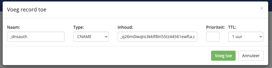 Voor de validatie wordt een uniek CNAME-record aangemaakt dat verwijst naar de leverancier van het SSL-certificaat. Dit record wordt gecontroleerd voor elke domeinnaam in jouw aanvraag.