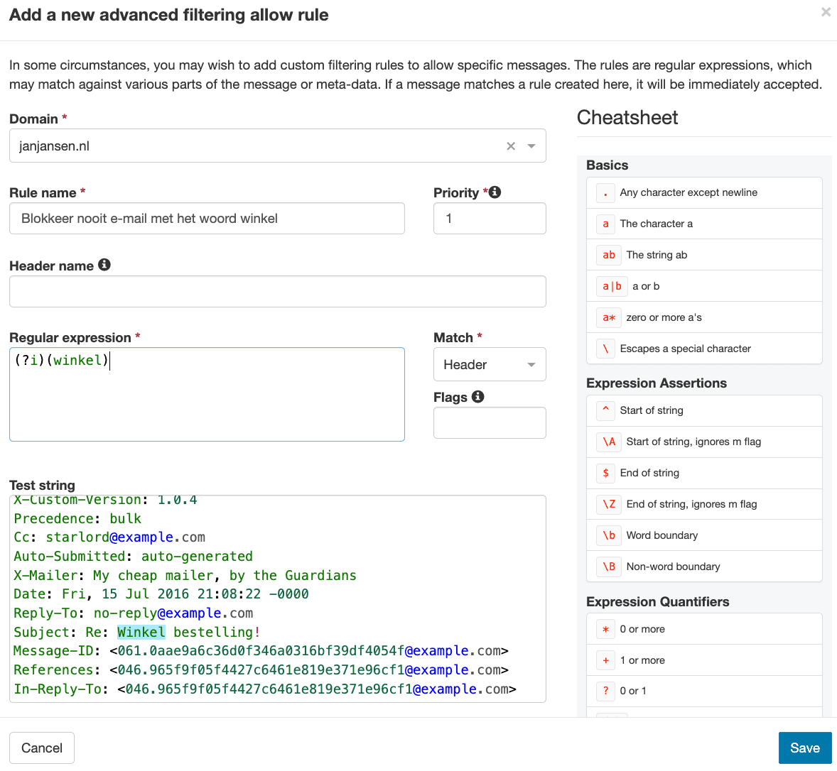 Je kunt nu aan de slag met reguliere expressies om bepaalde inkomende of uitgaande e-mail toe te staan of te weigeren. Voorbeelden van reguliere expressies die je kunt gebruiken vind je op deze pagina.