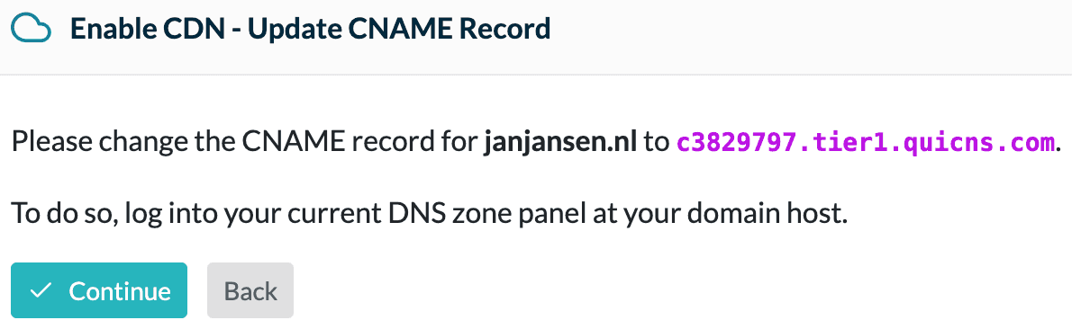- Pas nu de DNS van je domeinnaam aan. Het CNAME record voor www.jouwdomeinnaam.nl moet verwijzen naar het zojuist genoteerde adres.