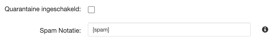 Om de spamfilter in het geheel uit te schakelen vink je op de Filterinstellingen pagina de optie Quarantaine ingeschakeld UIT. Daarnaast kan je de Spam Notatie instellen die wordt toegevoegd aan het onderwerp van e-mails die door het filtersysteem worden aangemerkt als spam.