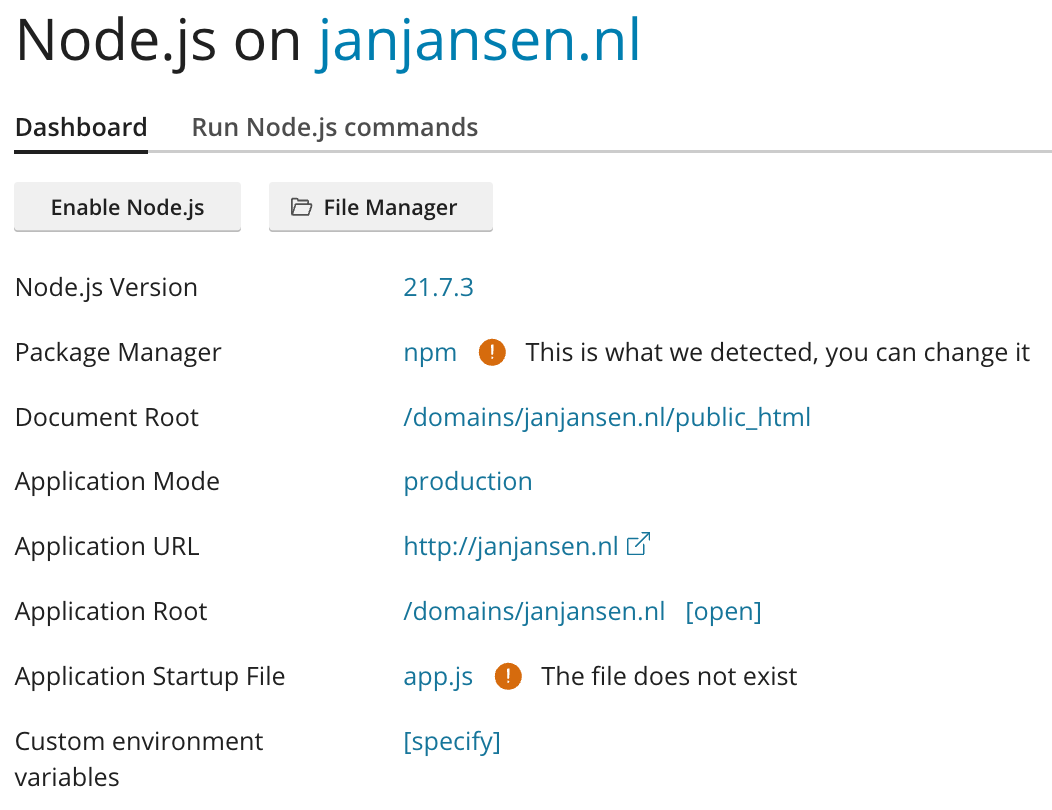 - zorg dat je hosting pakket ondersteuning heeft voor Node.js