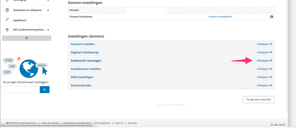 - Klik op ‘Uitklappen’ naast ‘Subdomein toevoegen’