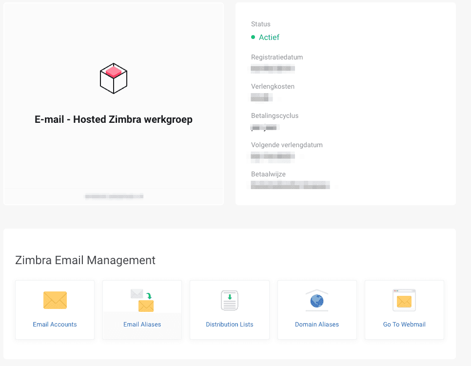 - Je bent nu in het Zimbra dashboard waar je jouw omgeving kunt beheren:
