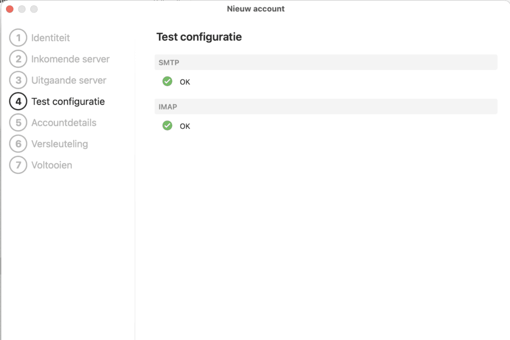 - Als alle gegevens correct zijn opgegeven, zie je bij SMTP en IMAP ‘OK’ met twee groene vinkjes. Klik vervolgens op ‘Volgende’:
