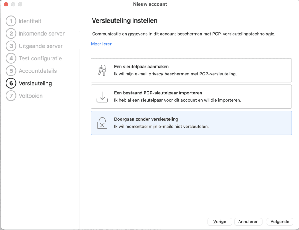 - De versleuteling kun je naar keuze instellen. Als je geen gebruik wilt maken, selecteer dan ‘Doorgaan zonder versleuteling’ en kies vervolgens voor ‘Volgende’: