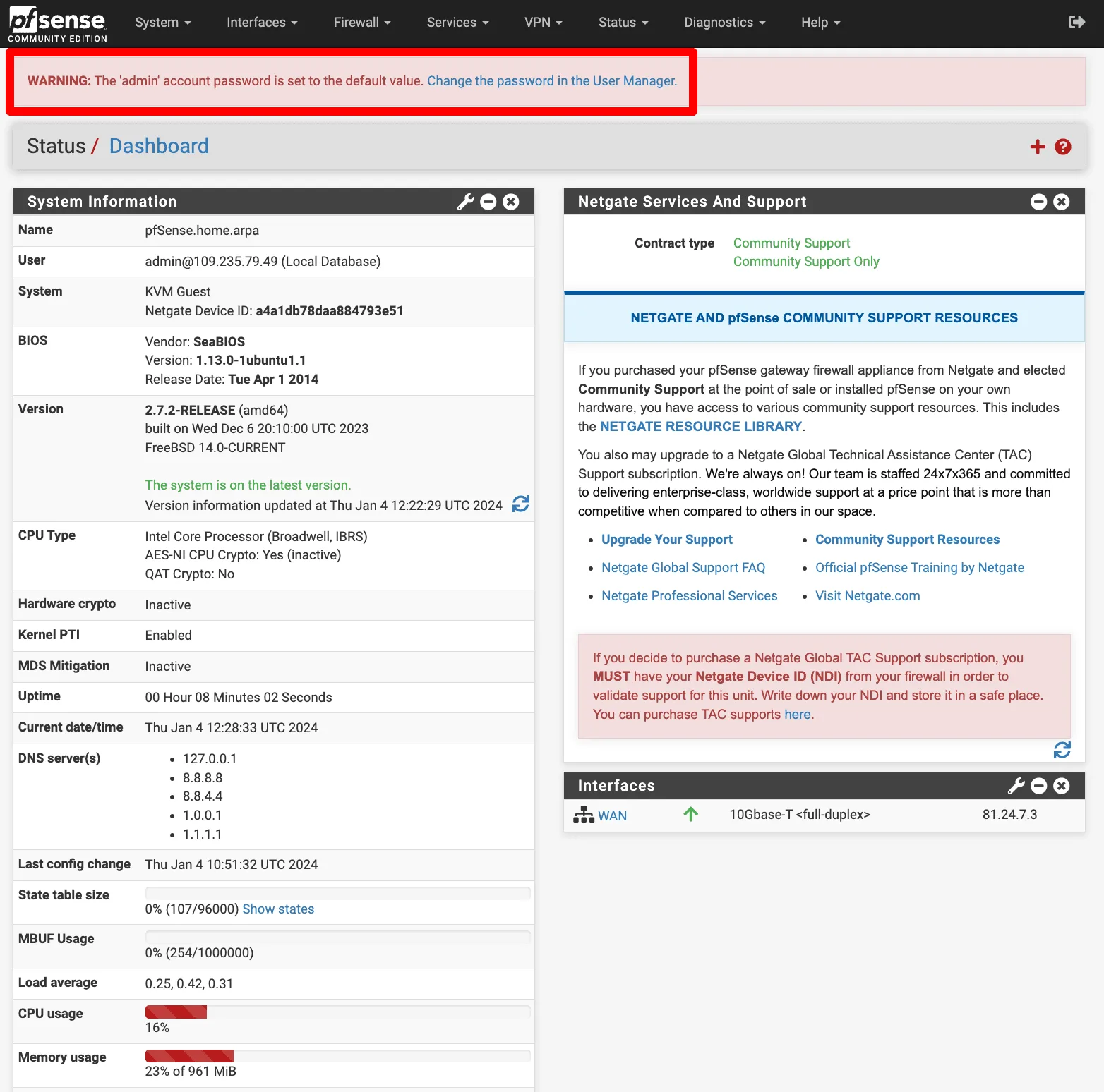 Je kunt nu via de console of de web interface aan de slag met de verdere configuratie van pfSense. Hoe je bij de console kan komen lees je hier. De web interface bereik je door in je webbrowser https://ip.van.pfSense.VPS te bezoeken.
