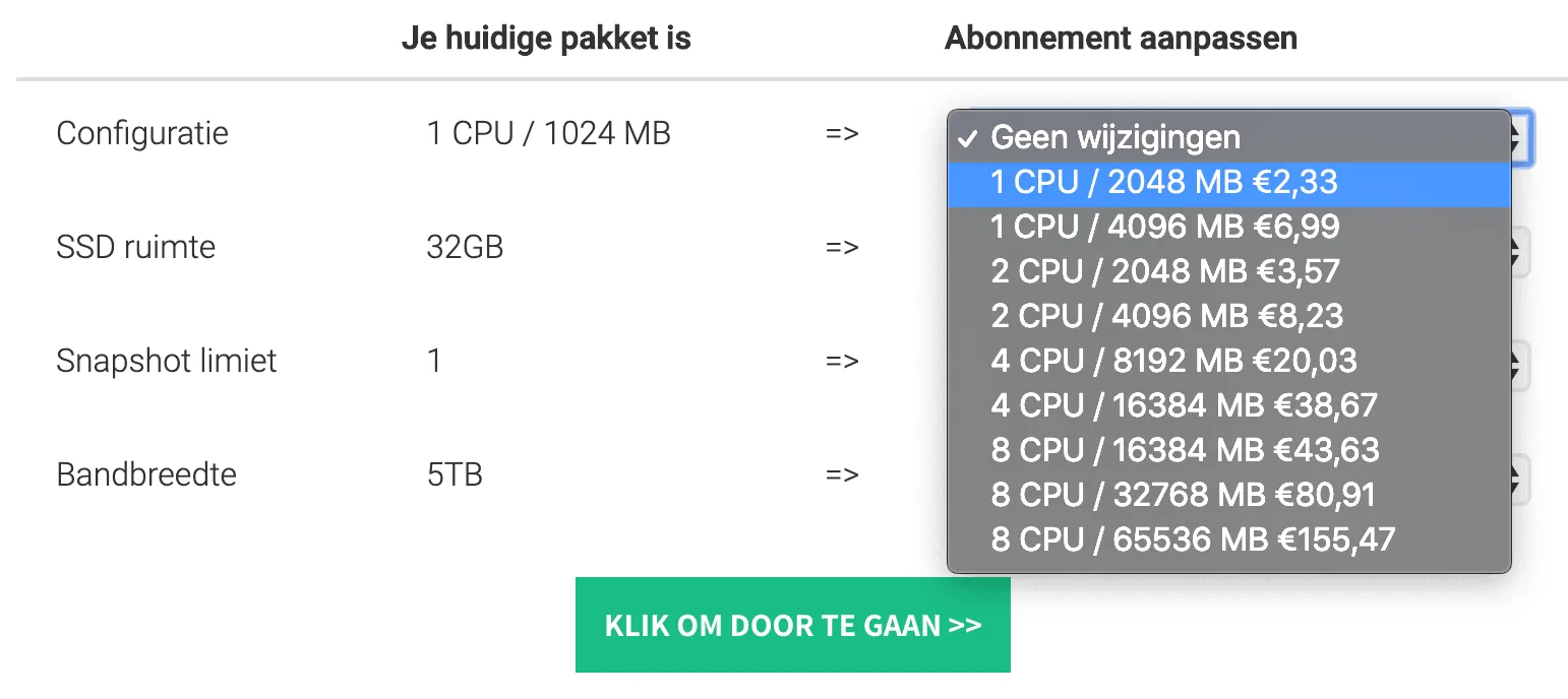 • Kies achter ‘Configuratie’ voor een nieuwe CPU / RAM combinatie.