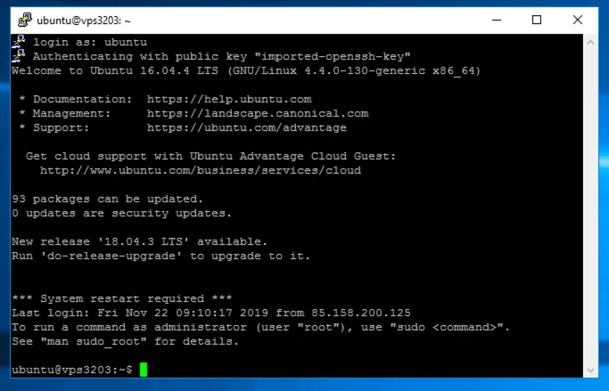 - Nu heb je succesvol een verbinding op gestart naar je ‘VPS’: