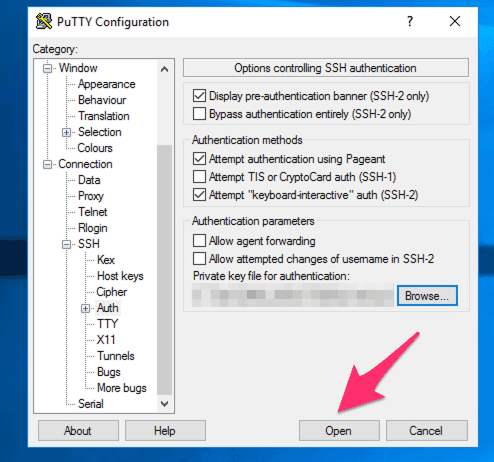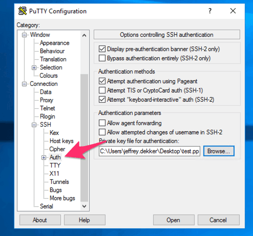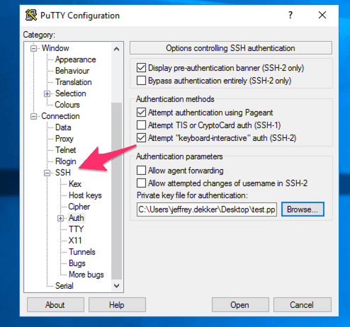11. Klik op ‘Browse’ bij ‘Private key file for authentication’: