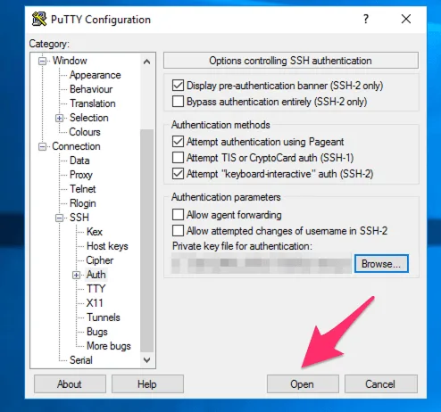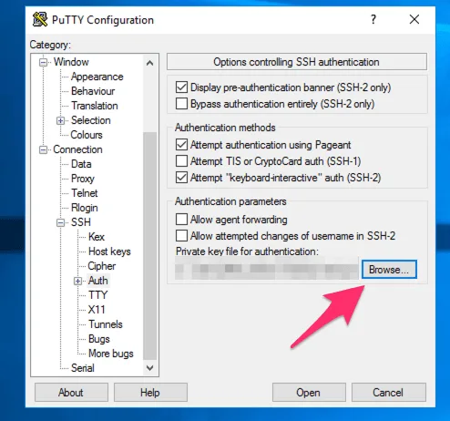 - Klik op ‘Browse’ bij ‘Private key file for authentication’: