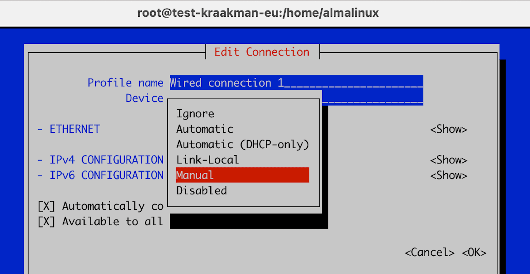 Pas de waarde voor IPv6 CONFIGURATION aan van Automatic naar Manual en klik daarna op Show