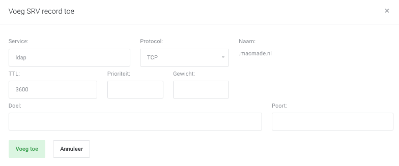 - Klik op ‘Voeg toe’ om het SRV record op te slaan