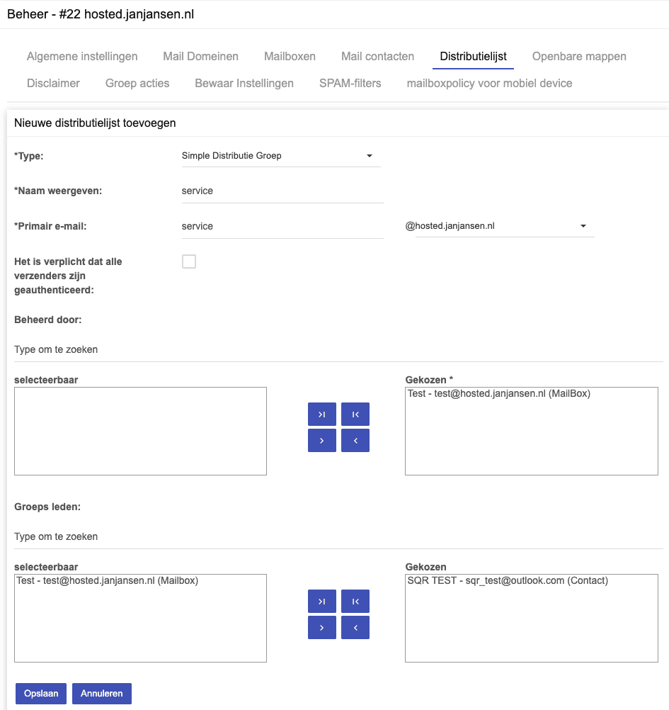 – Vul de velden ‘Naam weergeven‘ (weergave naam voor de ontvangers) en ‘Primair e-mail‘ (het e-mailadres van de distributielijst) in