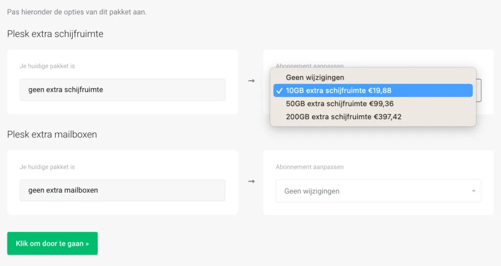 - Kies de gewenste uitbreiding, extra schijfruimte of mailboxen, door onder vanuit de dropdown ‘Abonnement aanpassen’ de gewenste uitbreiding te selecteren: