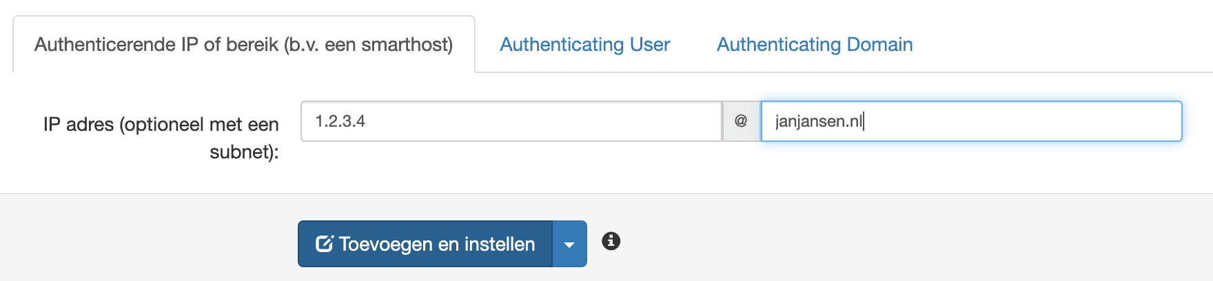 Je kunt aan de slag gaan met authenticatie op basis van IP adres of met authenticatie op basis van SMTP gebruikersnaam.