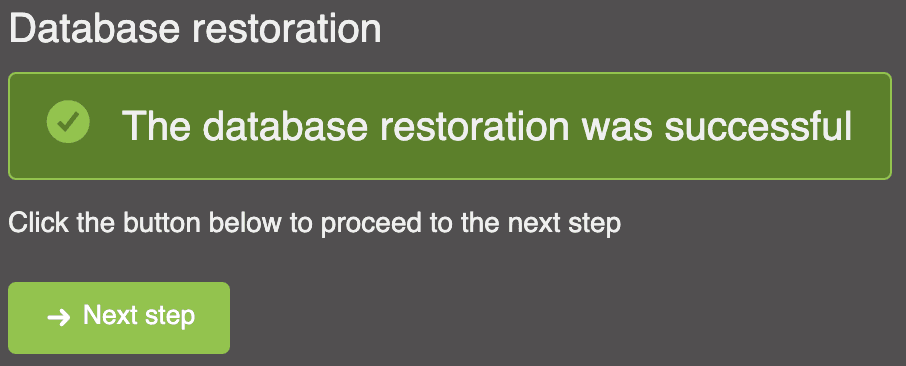 - Klik rechtsboven 2x op de licht blauwe ‘Next’ knop, de database wordt hersteld