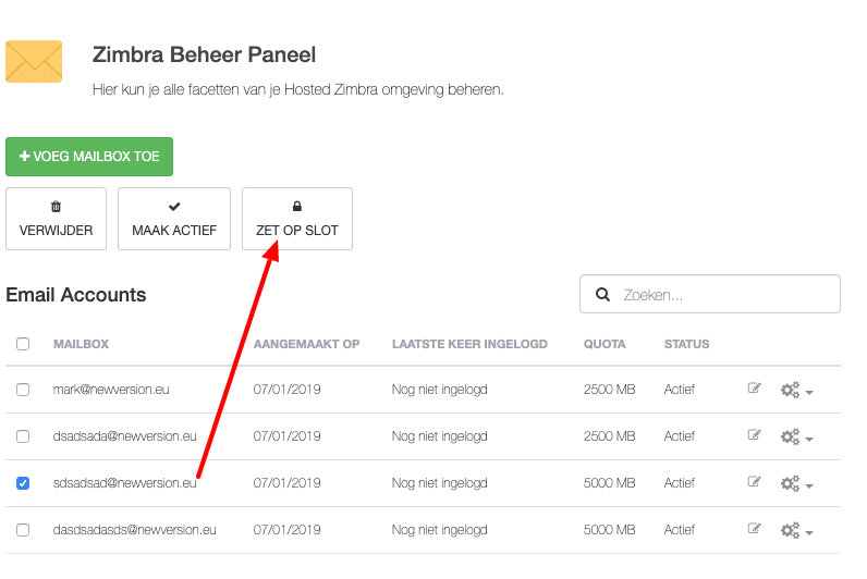 - Hier zie je alle mailboxen van jouw Hosted Zimbra omgeving terug.