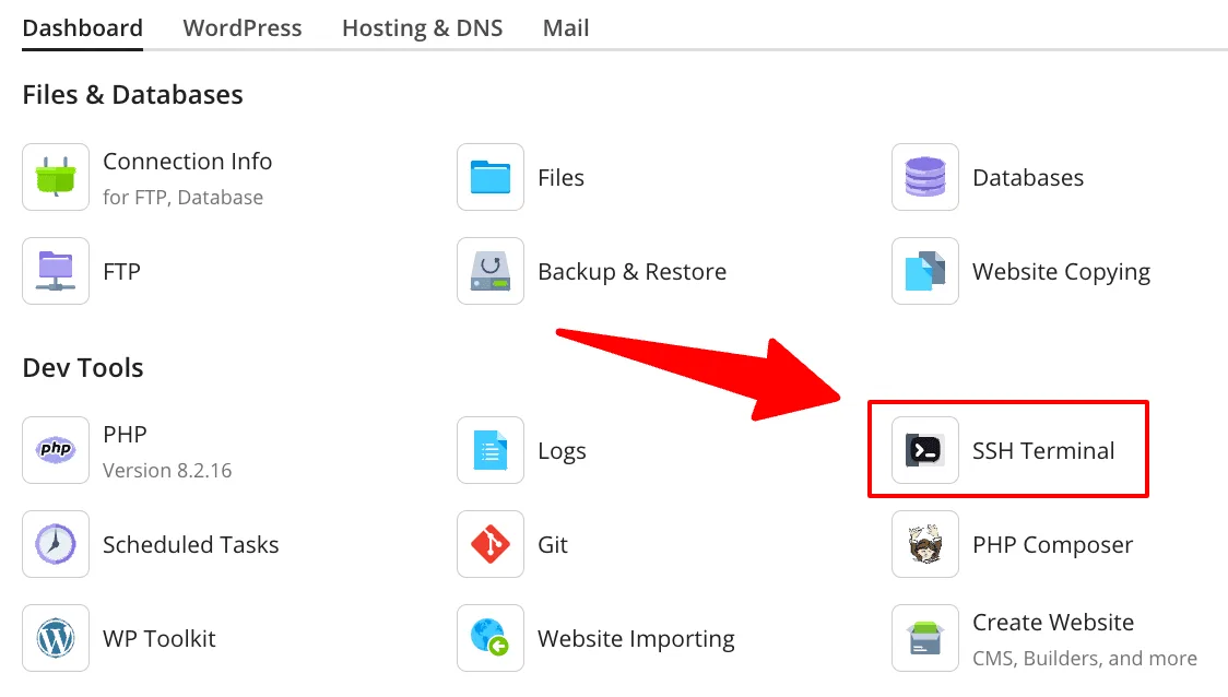 Klik in het Plesk Dashboard onder Dev Tools op SSH Terminal om verbinding te maken.