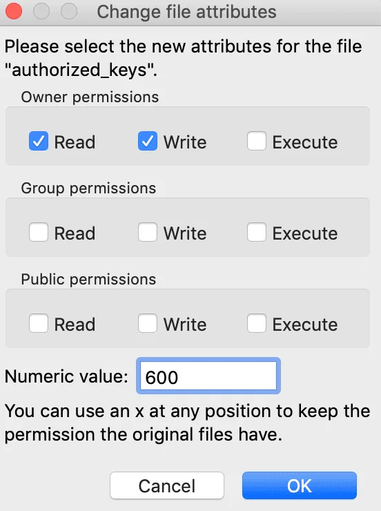 - Pas nu de rechten van het bestand aan en de map .ssh aan. De rechten dienen “600” (lees en schrijf rechten voor de eigenaar) te zijn op het bestand authorized_keys en 700 op de map .ssh.