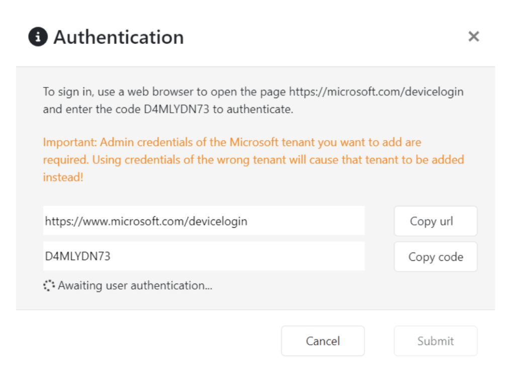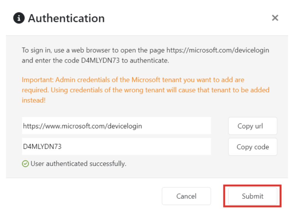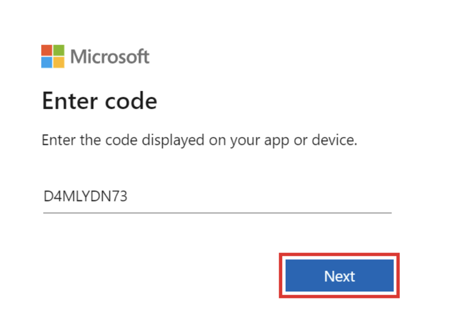 - Voer de code die in het vorige scherm gegenereerd is in en klik op Next.