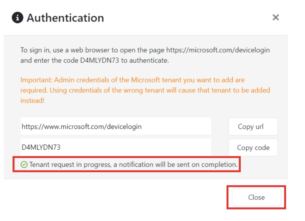 - Klik op Close, zodra je de melding hieronder ziet: