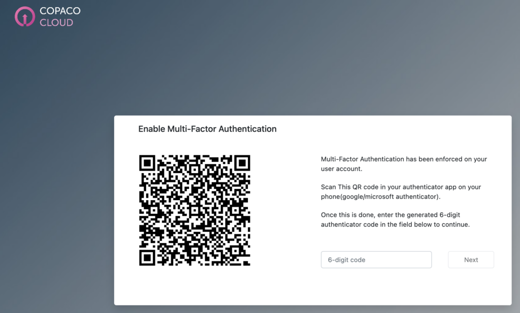 - Voer de code die in het vorige scherm gegenereerd is in en klik op Next.