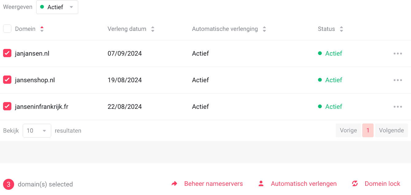 - Vink de domeinnaam of domeinnamen aan waarvoor je de nameservers wil wijzigen