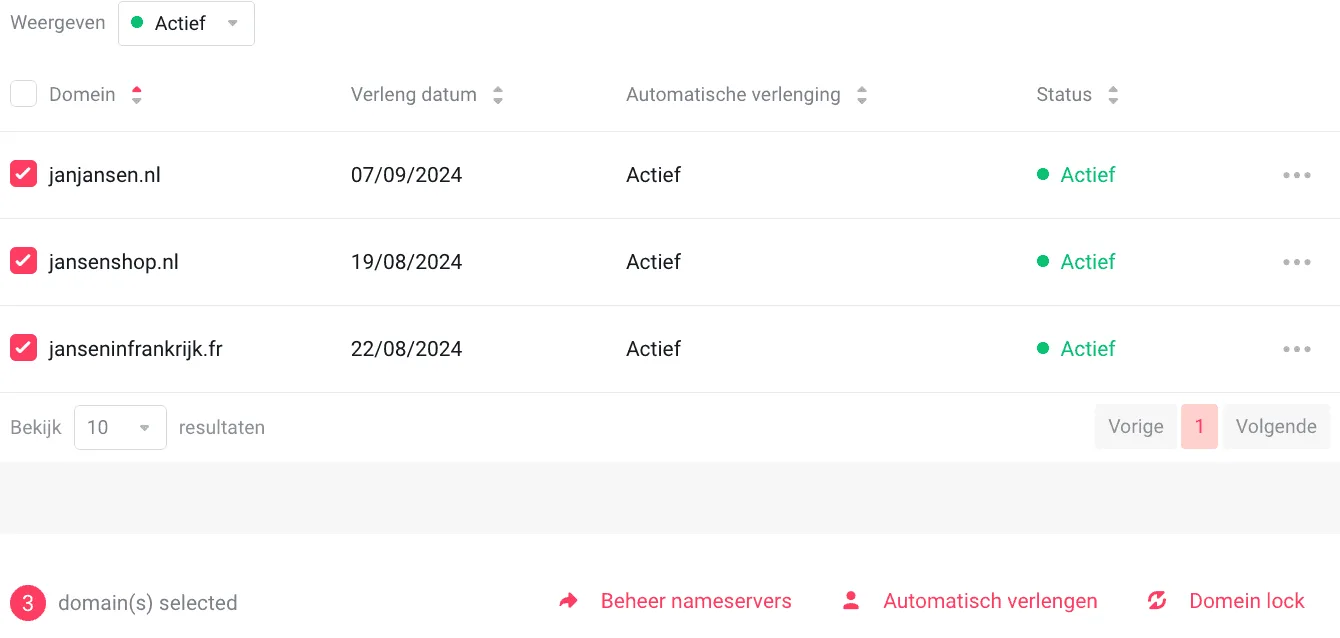 - Vink de domeinnaam of domeinnamen aan waarvoor je de nameservers wil wijzigen
