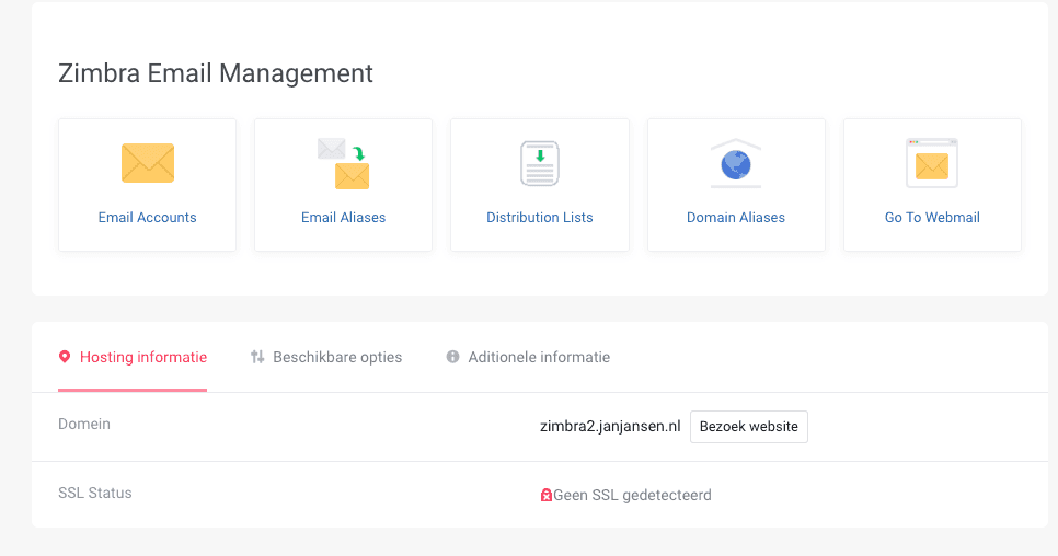 - Klik op de Hosted Zimbra omgeving waar je jouw nieuwe mailbox op wilt configureren