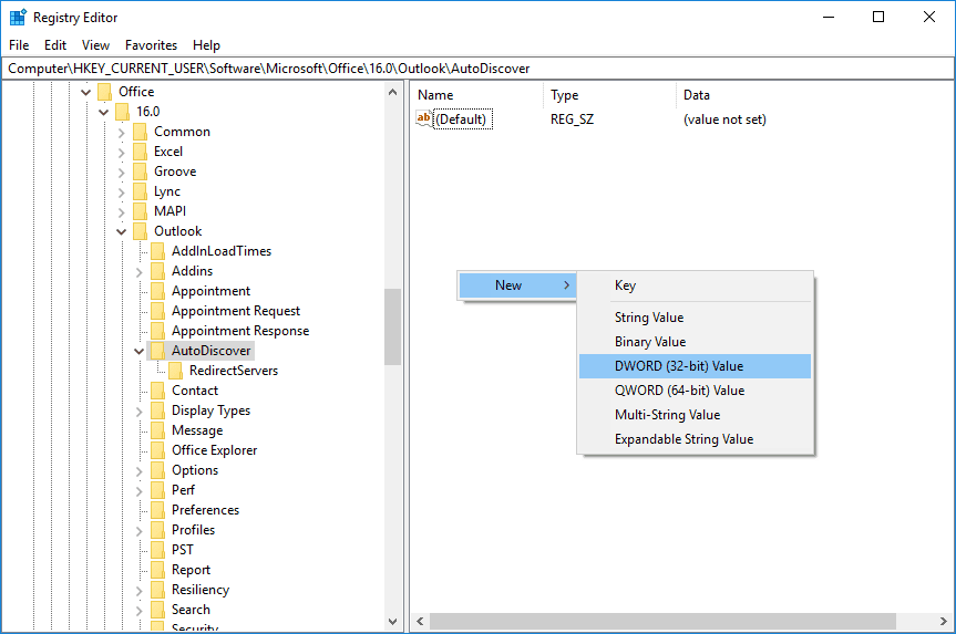 Ga dan via de linkerkant naar het volgende mapje: Computer\HKEY_CURRENT_USER\Software\Microsoft\Office\16.0\Outlook\AutoDiscover & Computer\HKEY_CURRENT_USER\Software\Policies\Microsoft\office\16.0\outlook\autodiscover