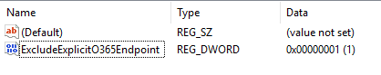 Vul als nieuwe waarde de naam “ExcludeExplicitO365Endpoint” (zonder aanhalingstekens) in met als waarde “1” (zonder aanhalingstekens).