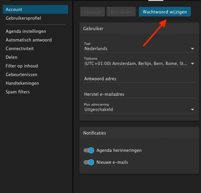 - Vul in het volgende scherm het oude én het nieuwe wachtwoord in, dat voldoet aan de eisen die in het rood staan: