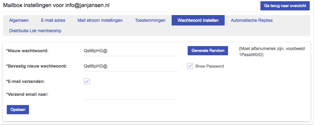 - Het nieuwe wachtwoord kun je ook direct naar een e-mailadres versturen. Als je dit wilt, vink dan ‘Verzend email naar:‘ aan en vul in het venster daaronder het gewenste e-mailadres in.