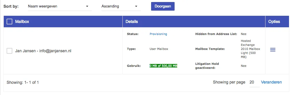 - Een overzicht met alle actieve mailboxen verschijnt: