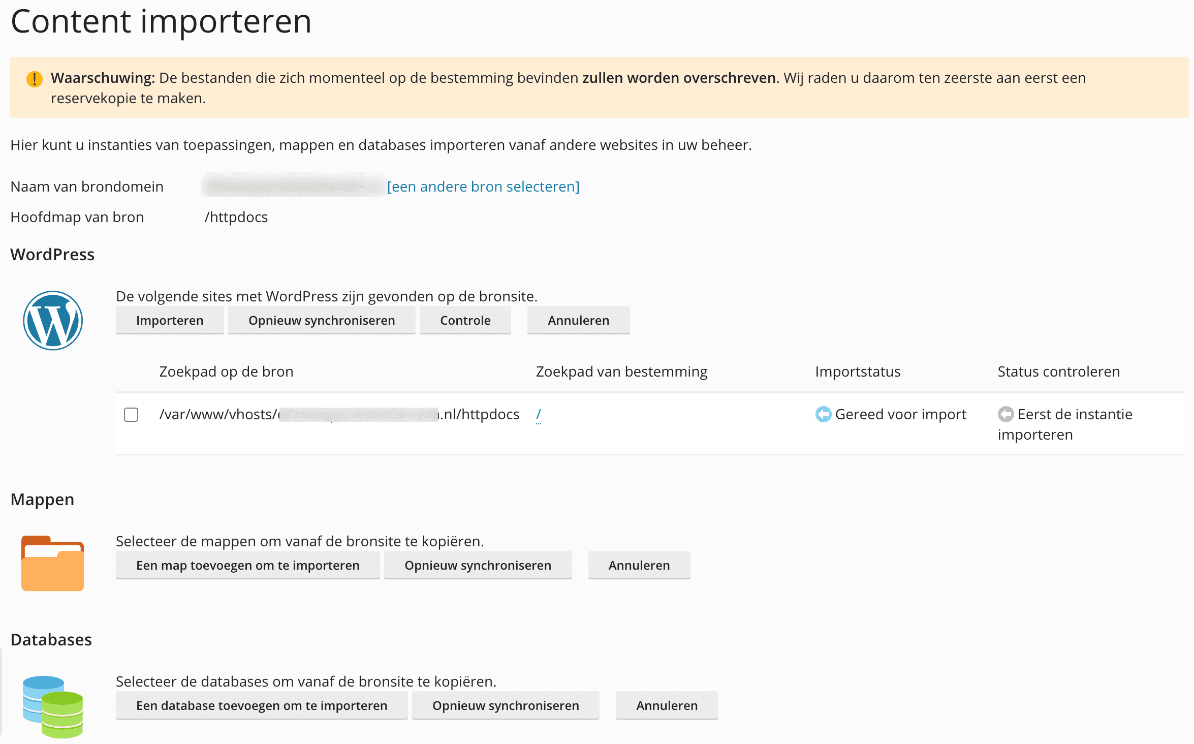 Let op: Indien er al een website op de huidige domeinnaam én server aanwezig is, wordt deze overschreven. Wil je de oude site bewaren, maak hier dan een backup van
