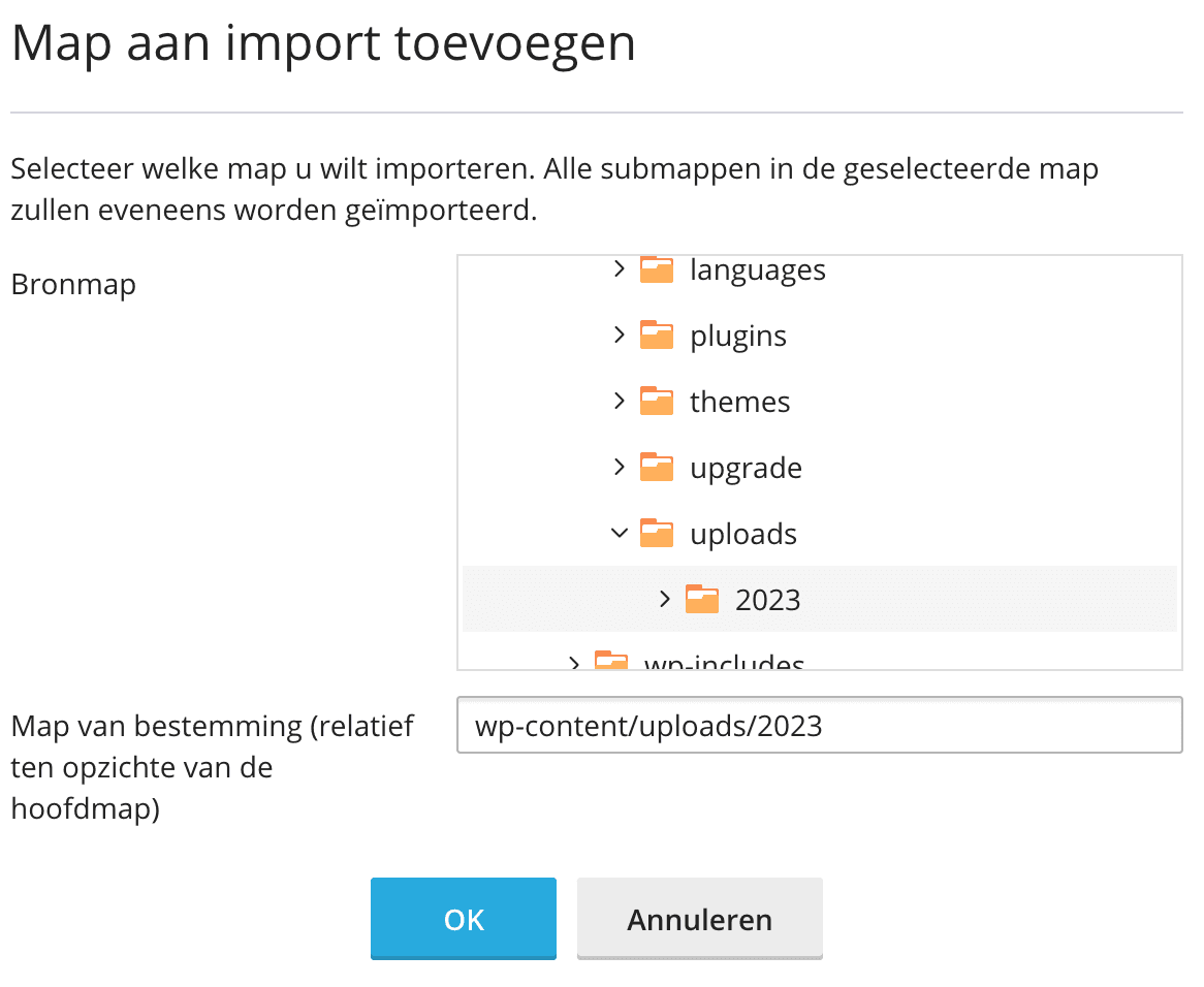 Klik op de knop Een map toevoegen om te importeren en selecteer daarna de map die je wilt importeren, bijvoorbeeld de wp-content/uploads/2023 map zoals in onderstaand voorbeeld.